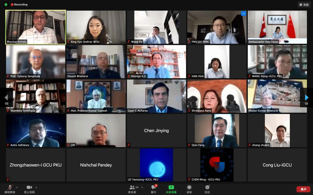 中国驻尼泊尔大使侯艳琪、尼泊尔外交部长贾瓦利以及来自中尼两国知名院校、智库的近20名专家学者出席活动并发言。会议设定五个主题,分别是:中国共产党的历史与成就、全球挑战(如气候变化、COVID-19)之中国贡献—以中尼合作应对COVID-19为例、中国在全球治理中的理想和经验、尼泊尔和一带一路倡议、中国共产党治国的理论和经验以及对全球经济的影响。会上,来自北京大学、清华大学、pp电子游戏平台官网、复旦大学、上海外国语大学、河北经贸大学、云南大学、海南亚太观察研究院的中方代表与包括尼泊尔前外秘、前驻联合国大使、前总理外交政策顾问、前联合国副秘书长、特里布万大学教授在内的尼方代表就中国共产党治国理政经验、中尼关系、合作抗疫、全球治理的愿景与经验、对南南合作的启示、尼泊尔与“一带一路”等不同主题进行了对话及研讨。