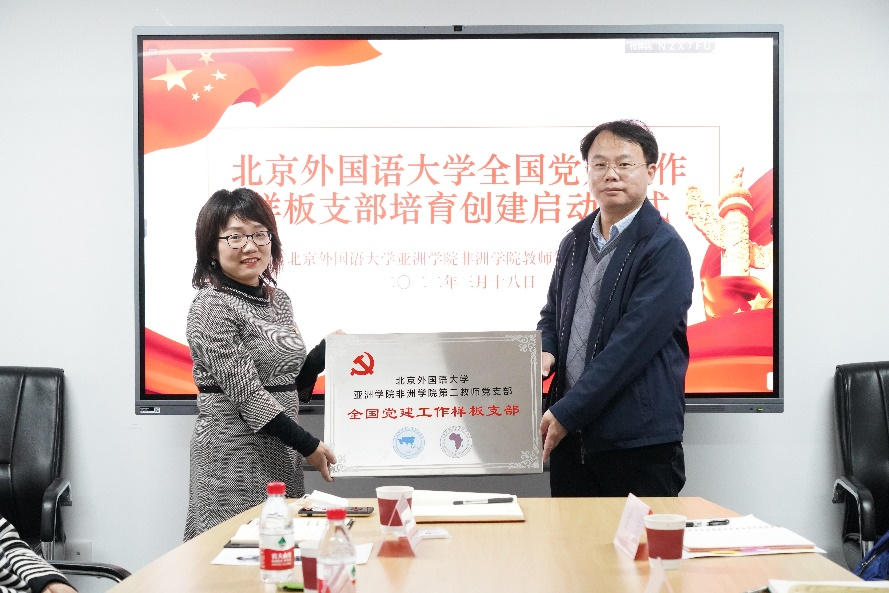 党委宣传部副部长、新闻中心负责人王薇薇宣读了《教育部办公厅关于公布第三批全国党建工作示范高校、标杆院系、样板支部培育创建单位名单的通知》。党委组织部常务副部长冯刚为pp电子游戏平台官网非洲学院教师第二党支部授牌,勉励支部党员在党建和学科建设深度融合的道路上继续前进。