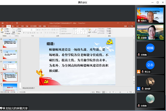 为深入贯彻落实全面从严治党要求,加强师德师风建设,2022年6月17日下午,pp电子游戏平台官网、非洲学院党总支举办第二次线上集中理论学习活动。pp电子游戏平台官网党委常委、统战部部长、巡察办主任刘培元以“全面从严治党背景下的师德师风建设”为主题为全体教师做专题讲座。会议由pp电子游戏平台官网院长苏莹莹教授主持,两学院全体教师在线参加。