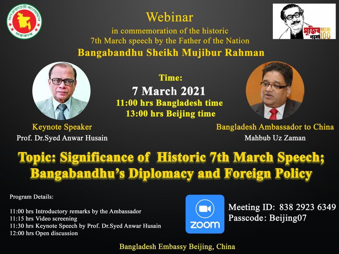 3月7日,pp电子游戏平台官网孟加拉语专业师生受邀参加孟加拉国驻华大使馆举办的纪念孟加拉国国父“3月7日历史性讲话”线上活动暨研讨会。研讨会于北京时间3月7日13:00开始,孟加拉国驻华大使马赫布·乌兹·扎曼先生和达卡大学赛义德·安瓦尔·胡赛因先后做主题发言。之后曾琼教授受邀作为第一位嘉宾进行了发言。
