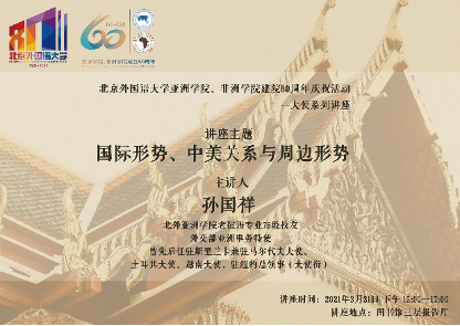 讲座伊始,孙大使向北外建校80周年、学院建院60周年表示祝贺,并由衷感谢母校对他的培养,认为老师们的言传身教不仅让他学到了知识,更教会了他如何 做人、怎样做事。他希望参加讲座的学弟学妹们好好把握在校时间,努力学习知识,实现自己梦想的同时,为中华民族的伟大复兴做出贡献。