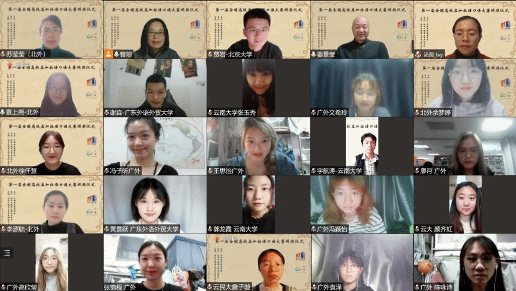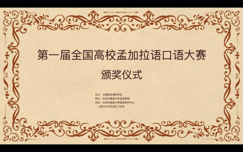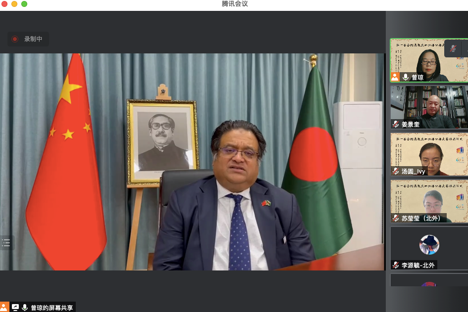 2021年10月29日晚,“第一届全国高校孟加拉语专业口语大赛”颁奖仪式以线上形式举行。孟加拉国驻华大使为发来祝贺视频,中国南亚语种学会会长、教育部高校外指委副主任委员、非通用语分指委主任委员、北京大学南亚研究中心主任姜景奎教授,pp电子游戏平台官网院长苏莹莹教授出席仪式并致辞,中央广播电视总台孟加拉语部于广悦主任发来贺词。出席颁奖仪式的还有中国南亚语种学会秘书长、北京大学外国语学院助理教授贾岩博士,pp电子游戏平台官网、广东外语外贸大学、云南民族大学、云南大学孟加拉语专业师生共计50余人。颁奖仪式由pp电子游戏平台官网孟加拉语教研室主任曾琼教授主持。
