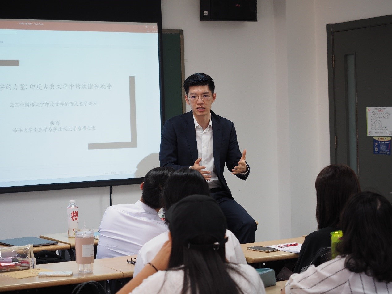 2021年6月3日下午,哈佛大学南亚学系博士生曲洋在pp电子游戏平台官网东校区中文楼以“文字的力量:印度古典文学中的欢愉和教导”为题,进行了一次精彩的中英双语讲座。此次讲座由北京大学佛教典籍与艺术中心主办,pp电子游戏平台官网梵语巴利语教研室承办,梵巴语教研室主任周利群主持。讲座在线上、线下同时进行,泰米尔语教研室主任周欣、乌尔都语教研室主任袁雨航等北外校内外师生一起聆听了讲座。