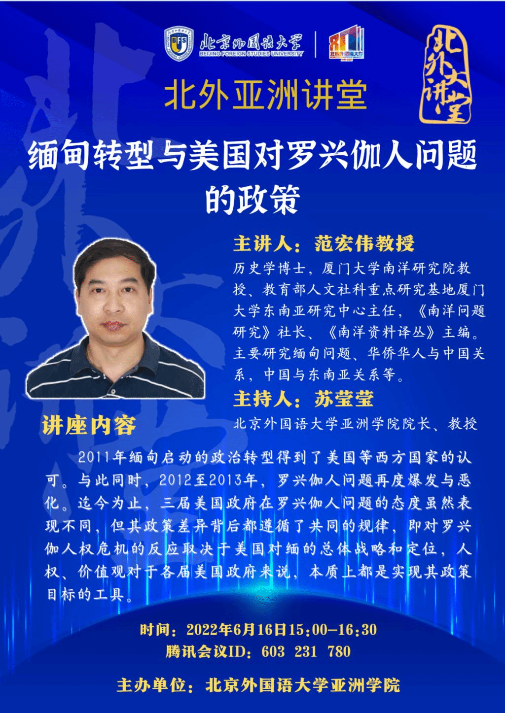 2022年6月16日下午,“北外亚洲讲堂”系列讲座“缅甸转型与美国对罗兴伽人问题的政策”线上开讲。本次讲座由厦门大学南洋研究院教授、《南洋问题研究》社长范宏伟教授主讲。pp电子游戏平台官网院长苏莹莹教授主持。来自pp电子游戏平台官网、厦门大学、云南大学等高校师生近100人参加了讲座。
