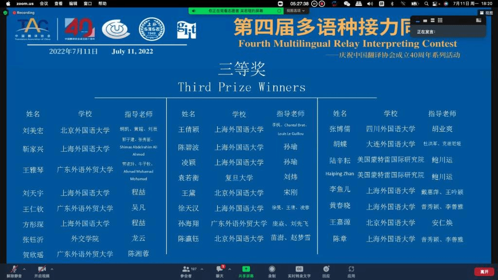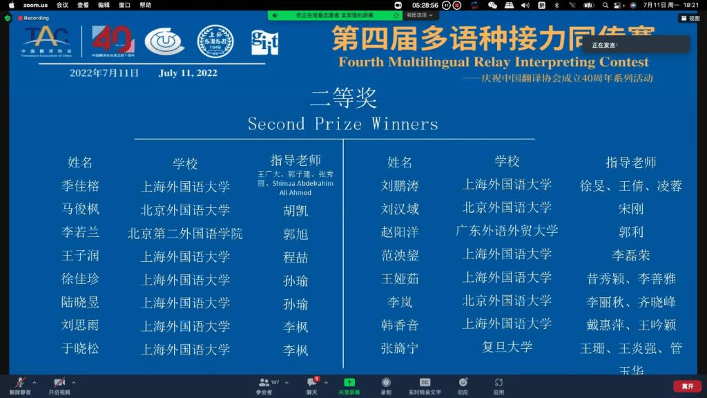 多语种同传接力赛创办于2018年,是全国范围内最高级别的多语种外语口译比赛之一。在成功举办2018、2019、2021三届比赛的基础上,本届比赛的决赛阶段赛事首次以线上、线下相结合的形式举行。经过5月的初赛后,国内外共有26所高校的128名选手入围8个语种的决赛阶段比赛,最终每个语种各评选出一等奖1人、二等奖2人、三等奖3人。