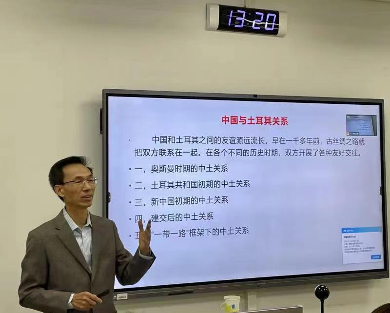 2022年11月2日,北外校友、前驻约旦、伊朗、土耳其大使郁红阳应pp电子游戏平台官网土耳其语教研室之邀,为本专业学生及学院地区研究方向部分研究生,做了题为“中土关系”的讲座。