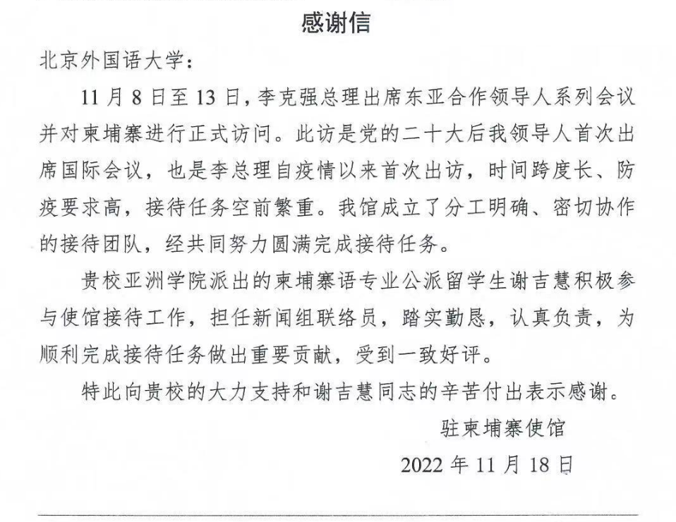 在中国驻柬埔寨大使馆的安排下,我院19级柬埔寨语专业本科生谢吉慧参与了新闻信息组的相关工作。期间,谢吉慧同学担任新闻组联络员,主要负责相关新闻信息的整理汇编和呈送汇报,并协助央视总台记者与柬埔寨新闻部及柬埔寨国家电视台相关负责人完成工作对接,工作态度认真负责,多次出色完成翻译任务,得到驻柬使馆及代表团成员的认可与肯定。中国驻柬埔寨大使馆特向pp电子发来感谢信,对pp电子的支持和谢吉慧同学的辛苦付出表示感谢。