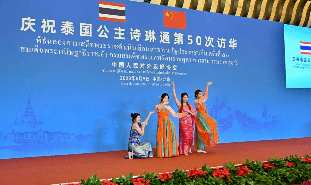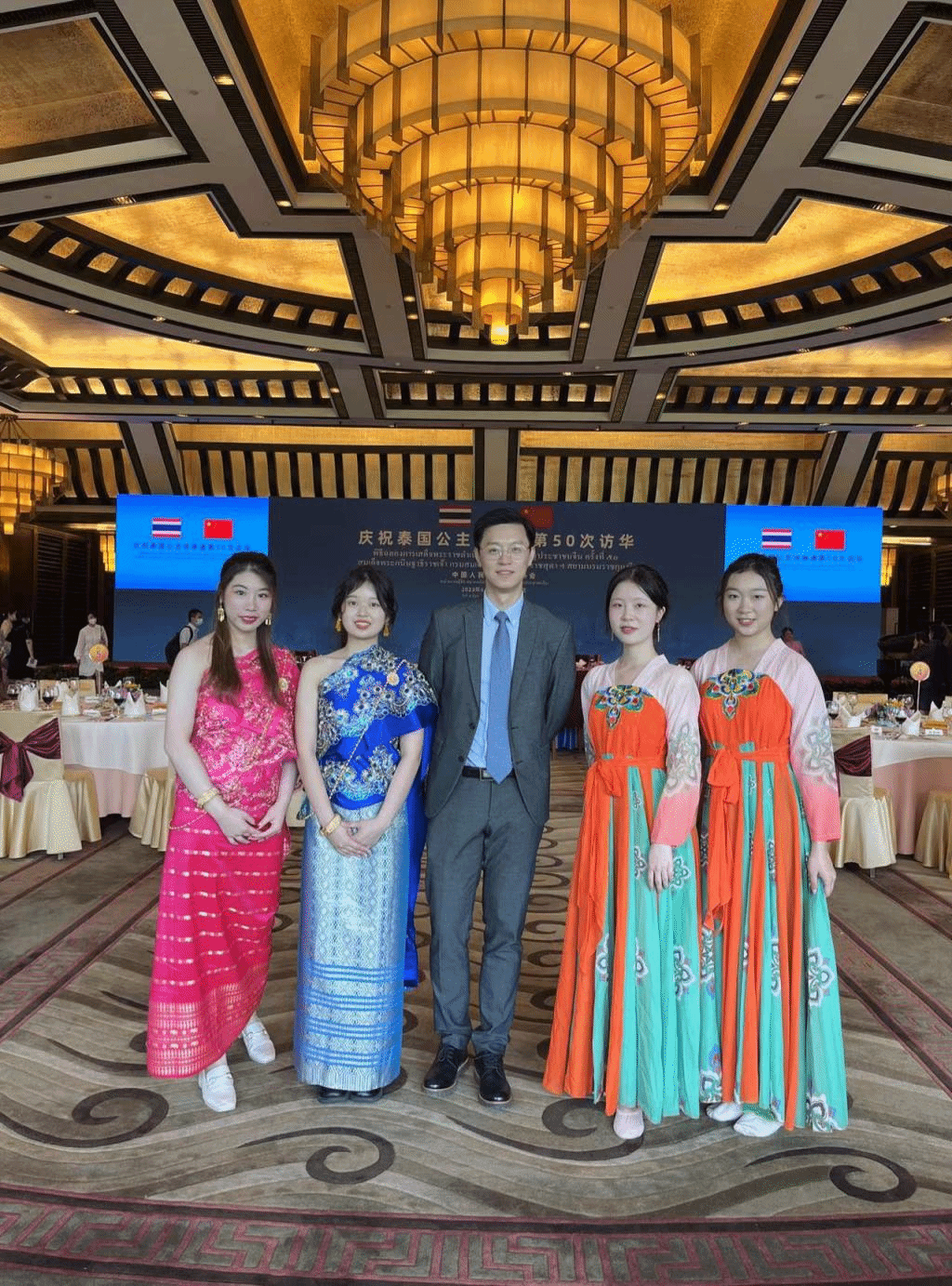 2023年6月5日,庆祝诗琳通公主第50次访华庆祝活动在钓鱼台国宾馆举行,pp电子pp电子游戏平台官网泰语专业2021级本科生受邀表演文艺节目,专业教师田霖为仪式和宴会担任翻译。
