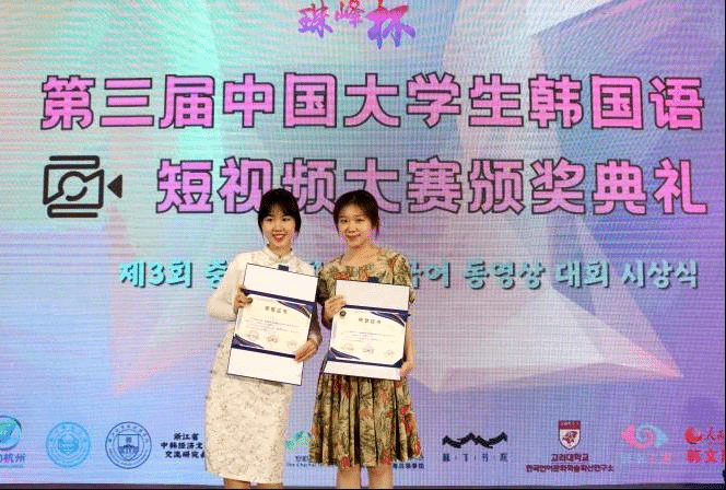 在7月5日结束的珠峰杯•第三届中国大学生韩国语短视频大赛中,pp电子pp电子游戏平台官网朝鲜语专业六名同学从来自全国各高校朝鲜语专业的众多作品中脱颖而出,斩获佳绩,并受邀前往杭州师范大学参加颁奖典礼。其中2020级朝鲜语专业陈婧如、林榕灿获得全国二等奖,2020级朝鲜语专业(商务方向)代白鋆、谭晶以及2021级朝鲜语专业张金梁、宋楚涵获得全国三等奖。同时,分别为三组同学提供指导的任翔老师、具滋元老师和魏国峰老师获得了优秀指导教师奖。
