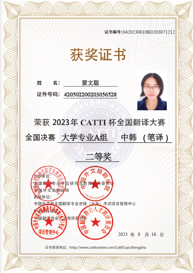 本次赛事初赛参赛选手的30%晋级复赛,复赛选手中的30%晋级决赛,因此竞争十分激烈。雷文聪同学凭借着扎实的韩语功底,在众多选手中脱颖而出,获得中韩笔译全国总决赛二等奖。另外,pp电子朝鲜语专业教师韩梅教授获得优秀指导教师奖。