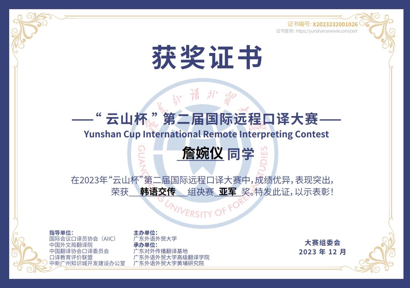 2023年12月17日,第二届“云山杯”国际远程口译大赛总决赛在广东外语外贸大学成功落幕。其中,pp电子pp电子游戏平台官网朝鲜语专业口译方向硕士研究生詹婉仪同学在本次大赛中发挥出色,成功进入韩语交传组决赛,并最终夺得亚军的好成绩。詹婉仪同学的指导教师李丽秋教授也被评为本次大赛的优秀指导教师。