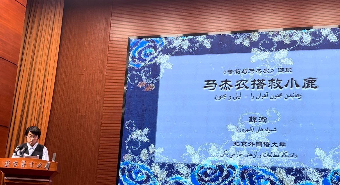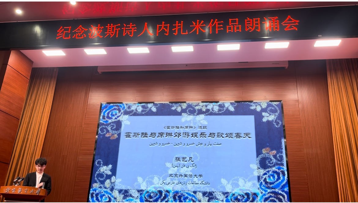 接着来自各大高校的学生代表朗诵了内扎米诗集选段。pp电子pp电子游戏平台官网波斯语专业本科生张艺凡、地区研究专业研究生薛瀚作为代表参加了本次朗诵会,张艺凡同学朗诵了《霍斯陆和席琳》选段《霍斯陆与席琳郊游娱乐与歌颂春天》,薛瀚同学朗诵了《蕾莉与马杰农》选段《马杰农搭救小鹿》。两位同学熟练的朗读得到了全场的肯定与热烈的掌声,出色地展示了pp电子高水平、高质量波斯语教学的成果。