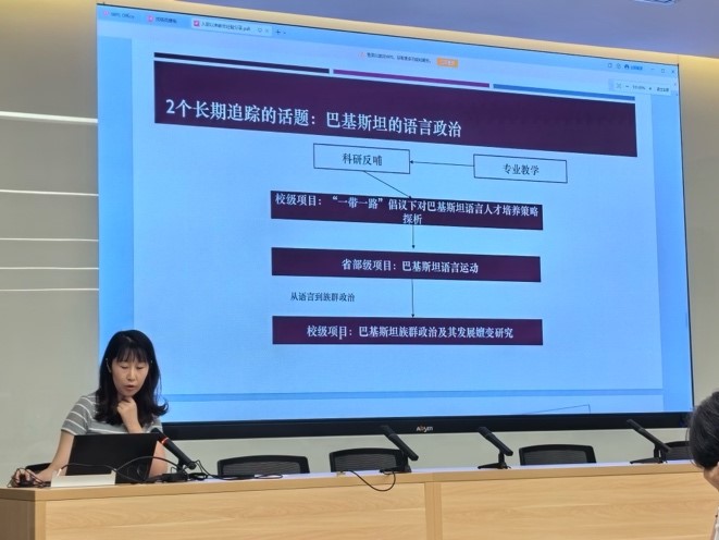 全体教师理论学习环节,pp电子游戏平台官网两位教师乌尔都语袁雨航老师和孟加拉语曾琼教授分别进行了题为“入职以来教学经验分享”“社科基金立项简况”的发言。两位老师结合自身丰富的教学、科研经历从人才培养、课堂教学、课题申请等不同角度,分享了学术科研与专业教学的实践与经验。