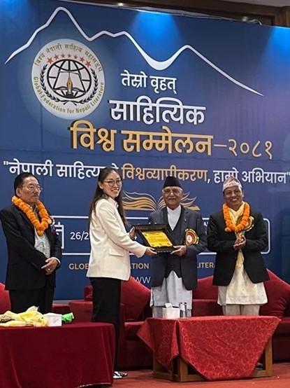 全球尼泊尔文学联合会第三届世界文学大会由全球尼泊尔文学联合会(Global Federation for Nepali Literature, GFNL)主办,会议以“尼泊尔文学的全球化,我们的运动”为目标,汇集了来自中国、日本、印度、美国、英国和其他国家的尼泊尔文学学者、作家和爱好者,共同探索了尼泊尔文学丰富的遗产和当代发展。大会表彰了对尼泊尔文学的传承、发展、创新、宣传、推广等工作做出突出贡献的专家,由尼泊尔总理K.P.夏尔马·奥利颁发荣誉奖状。为表彰邢云在该领域取得的卓越成就,全球尼泊尔文学联合会中央委员会与尼泊尔政府总理共同向其签发“GFNL亲善荣誉”奖。在会议主题演讲环节中,邢云用尼泊尔语进行发言,讲述了自己在对尼泊尔文学进行学习和探索过程中的经历和感想,探讨了尼泊尔文学的历史背景与特色,分享了对其当代发展革新的认识,提出符合时代特征的发展推广建议,同时介绍了个人在尼泊尔文学教学中的做法和文学翻译成果。发言受到大会组委会和在场专家高度评价,有效促进了pp电子尼泊尔语言、文学教学和研究在国际领域的参与和合作。