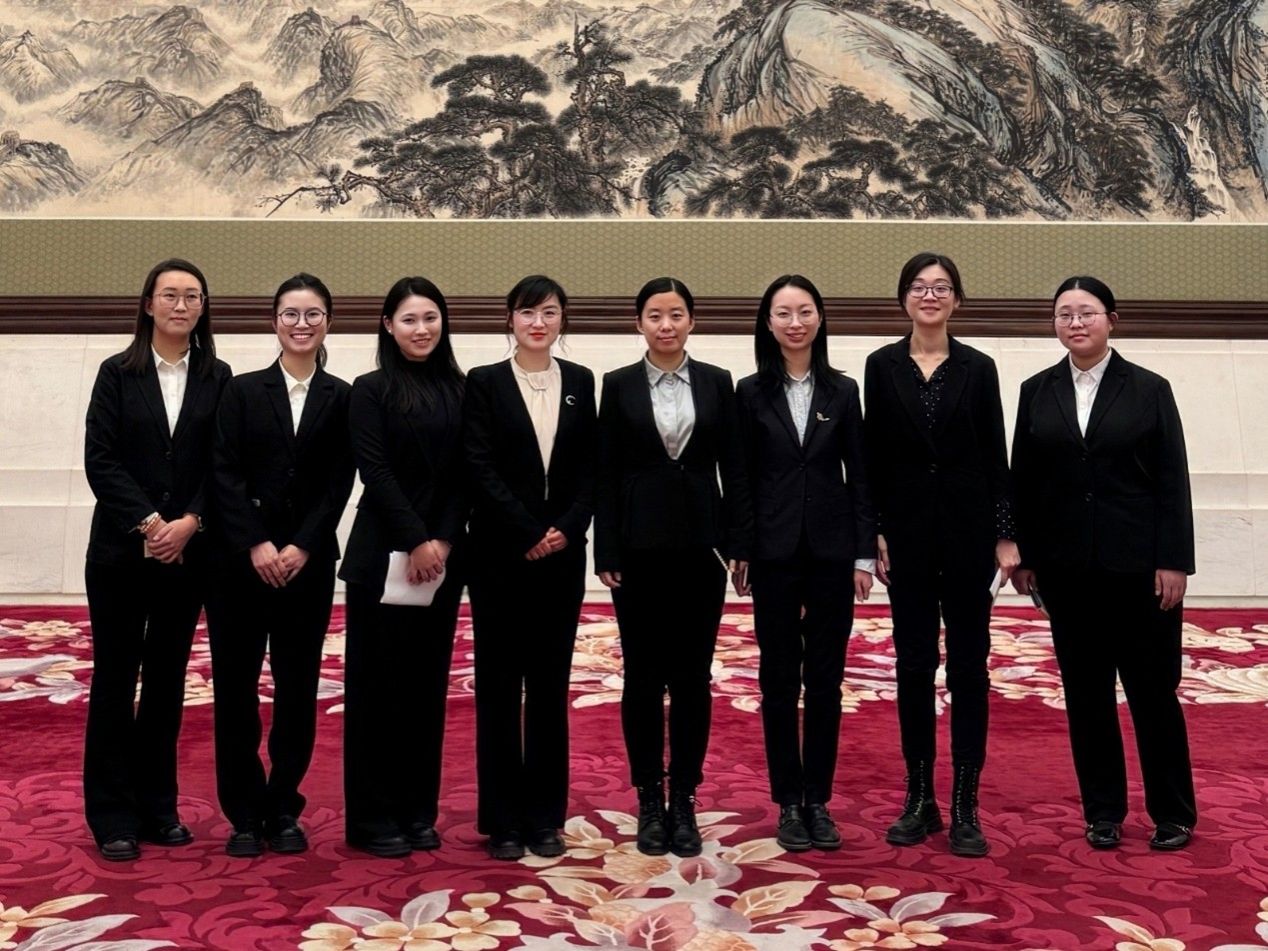 根据工作安排,pp电子pp电子游戏平台官网蒙古语教研室主任黄莹(上图左四)及2023级硕士研究生王羽婷(上图左三)、2024级硕士研究生钱时雨(上图右一)与中联部、北京大学等单位人员共同参与宴会翻译工作。