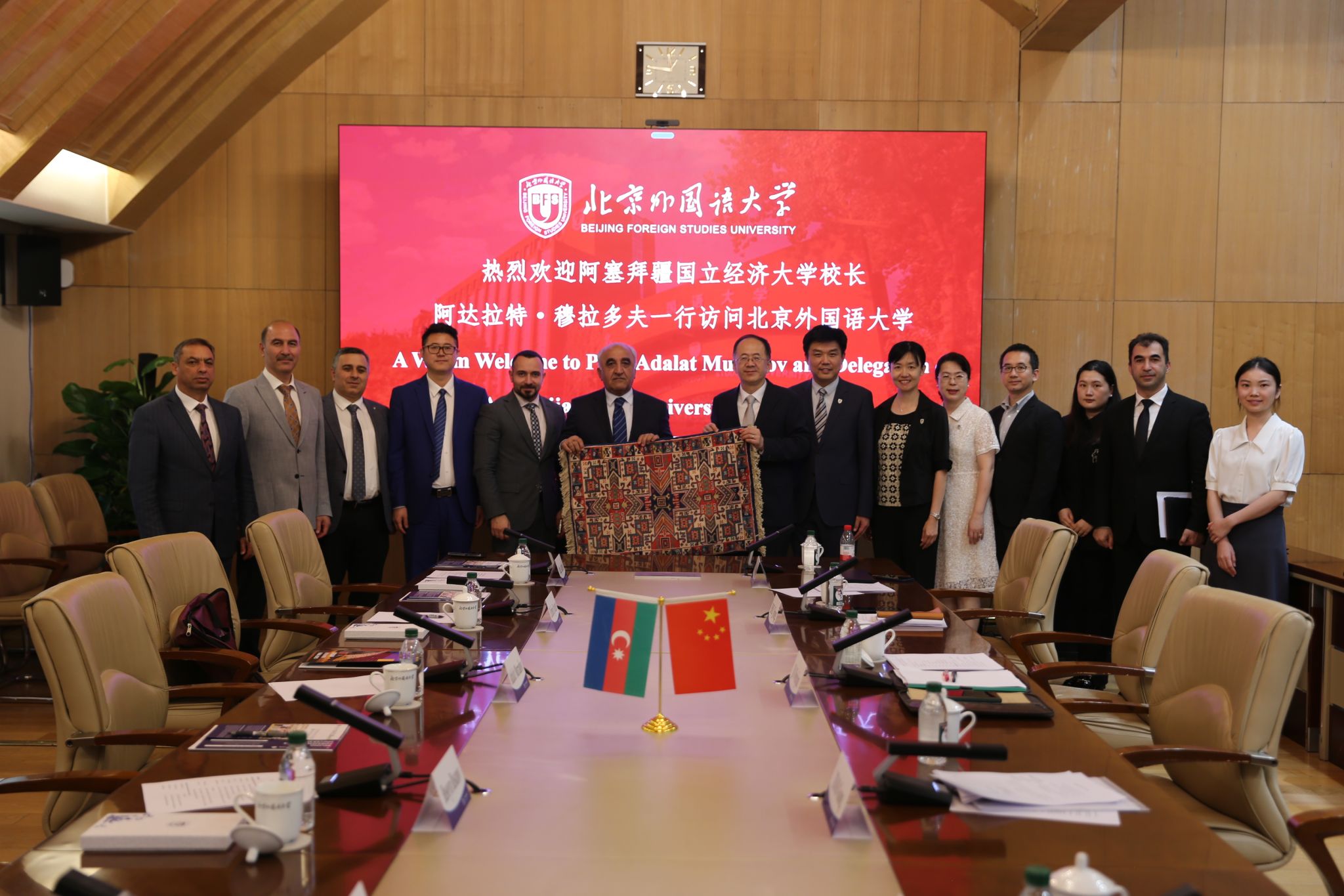 阿达拉特·穆拉多夫对北外的热情接待表示感谢,介绍了阿塞拜疆国立经济大学学科建设、教学科研、办学理念等总体情况,高度评价了北外在阿塞拜疆语和经济学人才培养方面的成就。他提议开展远程汉语教学、留学生培养与互换等项目,整合两校在线图书资源,并表示十分期待与北外进一步加强合作往来。