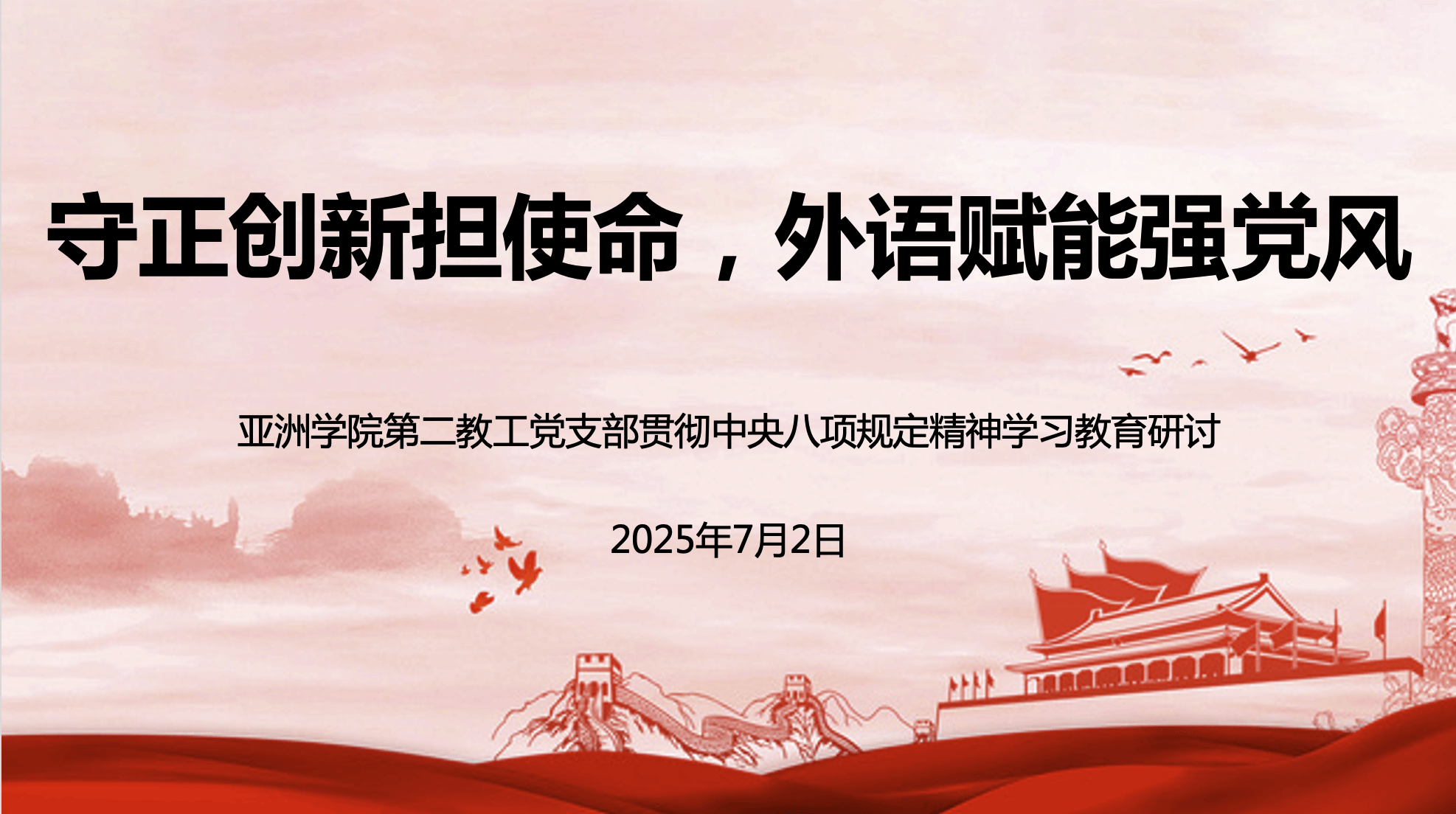 7月2日,pp电子游戏平台官网第二教工党支部围绕“守正创新担使命,外语赋能强党风”主题开展贯彻中央八项规定精神学习研讨活动。本次活动在7月1日“同上一堂课”活动之后,与会党员结合自身工作实际,充分交流、积极发言,畅谈学习体会,交流思想认识。活动由支部书记曾琼主持。