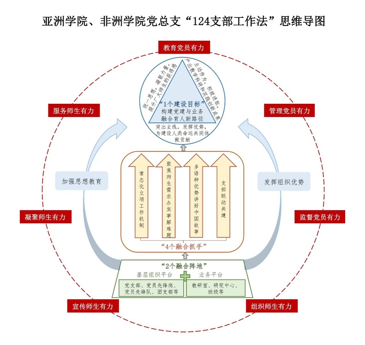各党支部要以党建与事业深度融合,推进党建和事业高质量发展为“1个建设目标”;依托基层组织平台(党支部、党员先锋岗、党员先锋队、团支部等)和业务平台(教研室、研究中心、班级等)“2大融合阵地”;以常态化立项工作机制、聚焦师生需求办实事解难题、多语种优势讲好中国故事、支部联动共建等因地制宜的工作举措为“4个融合抓手”,构建特色育人路径。